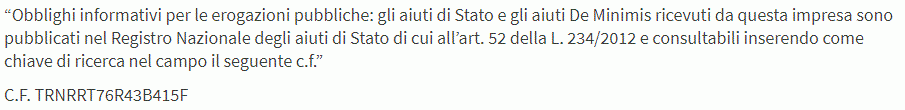 “Obblighi informativi per le erogazioni pubbliche: gli aiuti di Stato e gli aiuti De Minimis ricevuti da questa impresa sono pubblicati nel Registro Nazionale degli aiuti di Stato di cui all’art. 52 della L. 234/2012 e consultabili inserendo come chiave di ricerca nel campo il seguente c.f.”